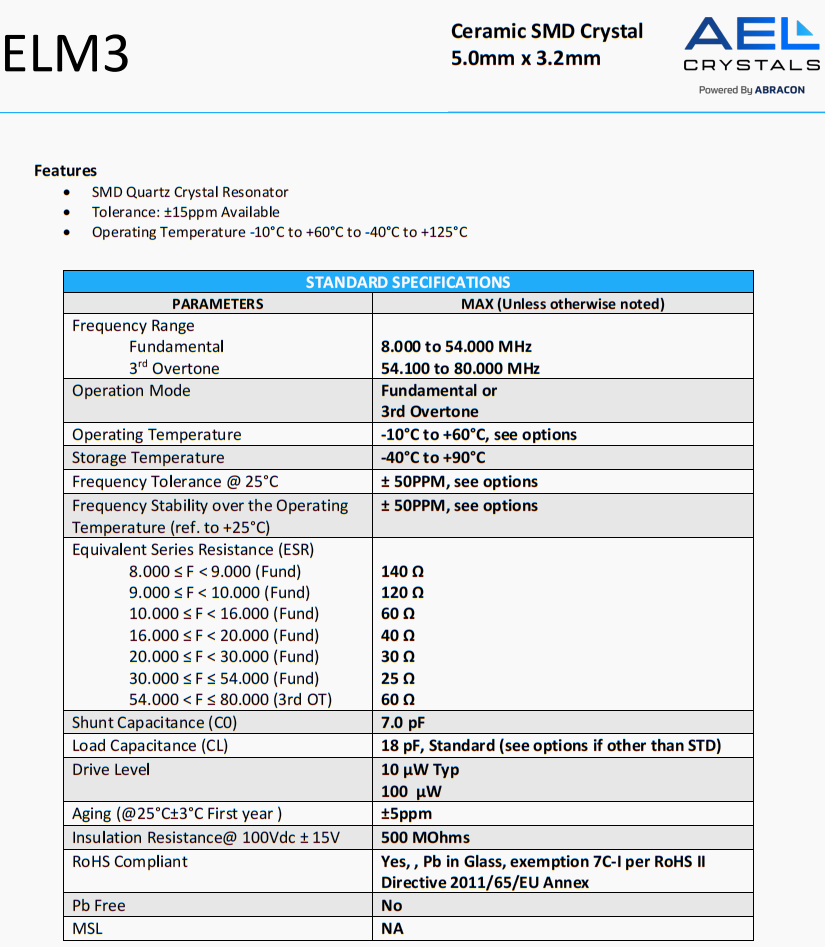 | ELM3-24.000MHz-18-R40-D4H-T | AEL Crystals | ELM3 | 24 MHz | ±50ppm | ±30ppm | 18 pF |