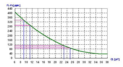 頻率的“牽引率”指的是負(fù)載電容CL1的頻率FL1到負(fù)載電容CL2的頻率FL2的頻率變化. 在圖中可以是FL1(CL=24pF)與FL2(CL=10pF)的頻率變化值. 在這個例子中的頻率牽引率是 220 ppm. 若我們將CL1與CL2的負(fù)載電容值趨近極小化(曲線作數(shù)學(xué)上的微分), 就會得到曲線的切線值. 這個切線值就是用某一個負(fù)載電容的敏感度( trim sensitivity ).