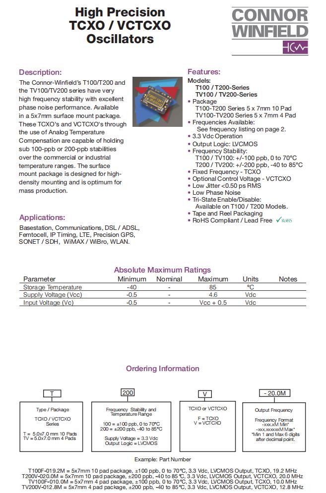 T200V-020.0M|VC-TCXO晶振|6G基站晶振,ConnorWinfield晶振,T200V有源晶振,T200V-020.0M晶振,VC-TCXO晶振,石英晶體振蕩器,7050mm晶振,頻率20MHz,電壓3.3V,工作溫度0~70°C,頻率穩(wěn)定性100ppb,低相噪晶振,高可靠性晶振,6G基站晶振,通信設備晶振,DSL / ADSL晶振,精密GPS晶振,無線網絡晶振,SONET/SDH設備晶振.