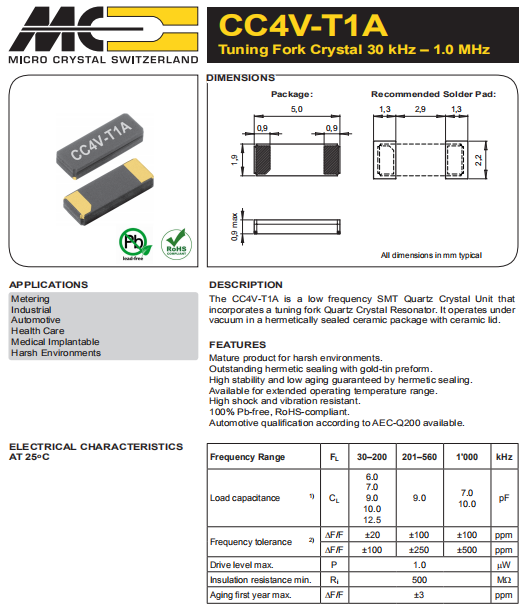 Microcrystal晶振,CC4V-T1A-32.768kHz-12.5pF-20PPM-TA-QC晶振,CC4V-T1A晶振,無(wú)鉛環(huán)保晶體.貼片石英晶體,體積小,焊接可采用自動(dòng)貼片系統(tǒng),產(chǎn)品本身小型,表面貼片晶振,特別適用于有小型化要求的電子數(shù)碼產(chǎn)品市場(chǎng)領(lǐng)域,因產(chǎn)品小型,薄型優(yōu)勢(shì),耐環(huán)境特性,包括耐高溫,耐沖擊性等,在移動(dòng)通信領(lǐng)域得到了廣泛的應(yīng)用,晶振產(chǎn)品本身可發(fā)揮優(yōu)良的電氣特性,滿(mǎn)足無(wú)鉛焊接的高溫回流溫度曲線要求.