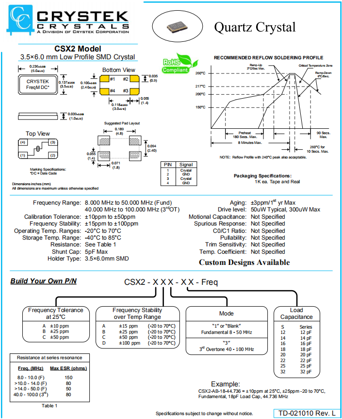 CRYSTEK晶振,CSX2晶振,耐高溫石英晶體.普通貼片石英晶振外觀使用金屬材料封裝的,具有高穩定性,高可靠性的石英晶體諧振器,晶振外觀本身使用金屬封裝,充分的密封性能,可確保其高可靠性,采用編帶包裝,外包裝采用朔膠盤,可在自動貼片機上對應自動貼裝等優勢.