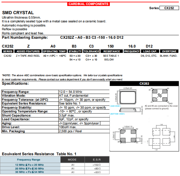 Cardinal晶振,CX252晶振,高品質(zhì)諧振器.小體積貼片2520晶振,外觀小型,表面貼片型晶體諧振器,因本身體積小等優(yōu)勢,適用于移動通信終端的基準(zhǔn)時鐘等移動通信領(lǐng)域.小型,薄型,輕型 (2.5 × 2.0 × 0.5 mm typ.) 具備優(yōu)良的耐環(huán)境特性及高耐熱性強.滿足無鉛焊接的回流溫度曲線要求.