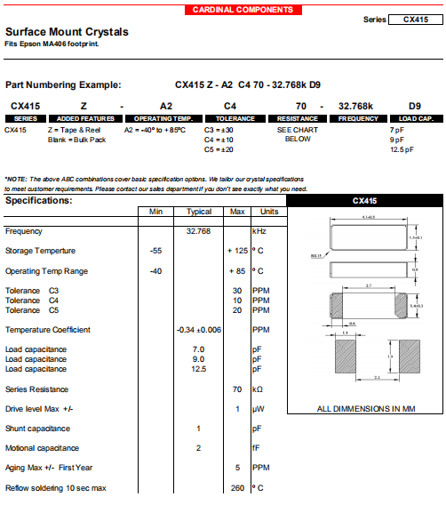 Cardinal晶振,CX415晶振,二腳貼片晶振.貼片表晶32.768K系列具有超小型,薄型,質地輕的表面貼片音叉型石英晶體諧振器,晶振產品本身具備優良的耐熱性,耐環境特性,在辦公自動化,家電領域,移動通信領域可發揮優良的電氣特性,符合無鉛標準,滿足無鉛焊接的回流溫度曲線要求,金屬外殼的石英晶振使得產品在封裝時能發揮比陶瓷晶振外殼更好的耐沖擊性能.
