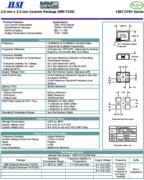 ILSI晶振,I787晶振,VC-TCXO晶振.具有最適合于移動通信設(shè)備用途的高穩(wěn)定的頻率溫度特性.為對應低電源電壓的產(chǎn)品.(可對應DC +1.8 V±0.1 V to +3.2 V±0.1 V )高度:最高1.0 mm,體積:0.007 cm3,重量:0.024g,超小型,輕型.低消耗電流,表面貼片型產(chǎn)品.(可對應回流焊) 無鉛產(chǎn)品.滿足無鉛焊接的回流溫度曲線要求.