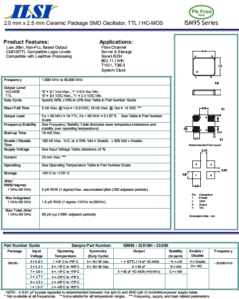 ILSI晶振,ISM95晶振,高質量振蕩器.2520mm體積的晶振,可以說是目前小型數碼產品的福音,目前超小型的智能手機里面所應用的就是小型的石英晶振,該產品最適用于無線通訊系統,無線局域網,已實現低相位噪聲,低電壓,低消費電流和高穩定度,超小型,質量輕等產品特點,產品本身編帶包裝方式,可對應自動高速貼片機應用,以及高溫回流焊接(產品無鉛對應),為無鉛產品.