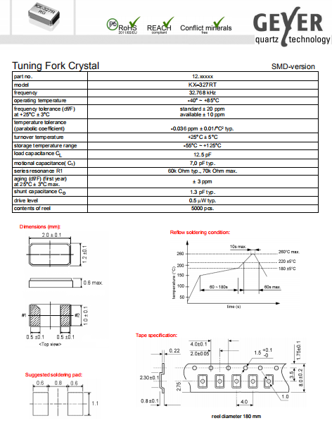 Geyer晶振,KX-327RT晶振,無源環(huán)保晶振.小體積SMD時鐘石英晶體諧振器,是貼片音叉晶體,千赫頻率元件,應(yīng)用于時鐘模塊,智能手機,全球定位系統(tǒng),因產(chǎn)品本身體積小,SMD編帶型,可應(yīng)用于高性能自動貼片焊接,被廣泛應(yīng)用到各種小巧的便攜式消費電子數(shù)碼時間產(chǎn)品,環(huán)保性能符合ROHS/無鉛標(biāo)準(zhǔn).