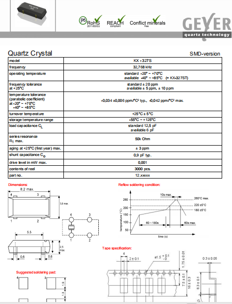 Geyer晶振,KX-327S晶振,無(wú)鉛環(huán)保晶振.超小型,薄型,質(zhì)地輕的表面貼片音叉型石英晶體諧振器,手機(jī)晶體,產(chǎn)品體積小,特別適用于各種小巧的便攜式消費(fèi)電子數(shù)碼產(chǎn)品,在移動(dòng)通信領(lǐng)域得到了廣泛的應(yīng)用,晶振產(chǎn)品本身可發(fā)揮優(yōu)良的電氣特性,滿足無(wú)鉛焊接的高溫回流溫度曲線要求.