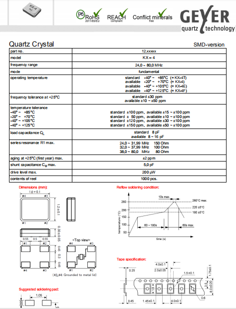 Geyer晶振,KX-4晶振,低功耗環(huán)保晶體.小型表面貼片晶振型,是標(biāo)準(zhǔn)的石英晶體諧振器,適用于寬溫范圍的電子數(shù)碼產(chǎn)品,家電電器及MP3,MP4,播放器,單片機(jī)等領(lǐng)域.可對(duì)應(yīng)24.000MHz以上的頻率,在電子數(shù)碼產(chǎn)品,以及家電相關(guān)電器領(lǐng)域里面發(fā)揮優(yōu)良的電氣特性,滿足無(wú)鉛焊接的回流溫度曲線要求.