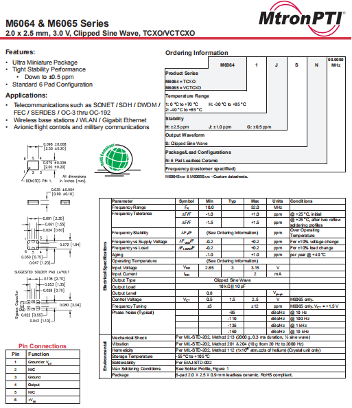 MTRONPTI晶振,M6065晶振,VC-TCXO晶振.2520mm體積的晶振,可以說是目前小型數碼產品的福音,目前超小型的智能手機里面所應用的就是小型的石英晶振,該產品最適用于無線通訊系統,無線局域網,已實現低相位噪聲,低電壓,低消費電流和高穩定度,超小型,質量輕等產品特點,產品本身編帶包裝方式,可對應自動高速貼片機應用,以及高溫回流焊接(產品無鉛對應),為無鉛產品.