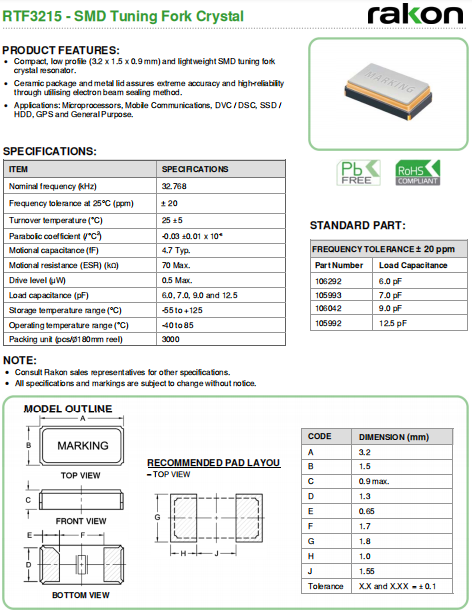 Rakon晶振,RTF3215晶振,壓電石英晶體.32.768K時(shí)鐘晶體具有小型,薄型,輕型的貼片晶振表面音叉型晶體諧振器,產(chǎn)品具有優(yōu)良的耐熱性,耐環(huán)境特性,可發(fā)揮晶振優(yōu)良的電氣特性,符合RoHS規(guī)定,滿足無鉛焊接的高溫回流溫度曲線要求,金屬外殼的封裝使得產(chǎn)品在封裝時(shí)能發(fā)揮比陶瓷諧振器外殼更好的耐沖擊性.