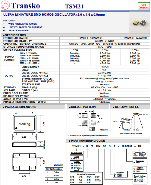 Transko晶振,TSM21晶振,低抖動(dòng)石英振蕩器.智能手機(jī)晶振,產(chǎn)品具有高精度超小型的表面貼片型石英晶體振蕩器,最適用于移動(dòng)通信終端的基準(zhǔn)時(shí)鐘等移動(dòng)通信領(lǐng)域.比如智能手機(jī),無線通信,衛(wèi)星導(dǎo)航,平臺(tái)基站等較高端的數(shù)碼產(chǎn)品,晶振本身小型,薄型具備各類移動(dòng)通信的基準(zhǔn)時(shí)鐘源用頻率,貼片晶振具有優(yōu)良的電氣特性,耐環(huán)境性能適用于移動(dòng)通信領(lǐng)域,滿足無鉛焊接的高溫回流溫度曲線要求.