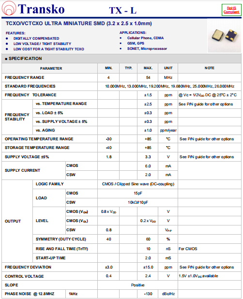 Transko晶振,TX-L晶振,VC-TCXO振蕩器.具有最適合于移動通信設備用途的高穩定的頻率溫度特性.為對應低電源電壓的產品.(可對應DC +1.8 V±0.1 V to +3.2 V±0.1 V )高度:最高1.0 mm,體積:0.007 cm3,重量:0.024g,超小型,輕型.低消耗電流,表面貼片型產品.(可對應回流焊) 無鉛產品.滿足無鉛焊接的回流溫度曲線要求.