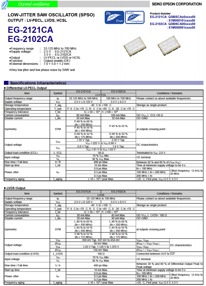 | X1M0002010007 | EG-2102CB | 625.000000 MHz | 5.00 x 3.20 x 1.40 mm | LV-PECL | 2.970 to 3.630 V |