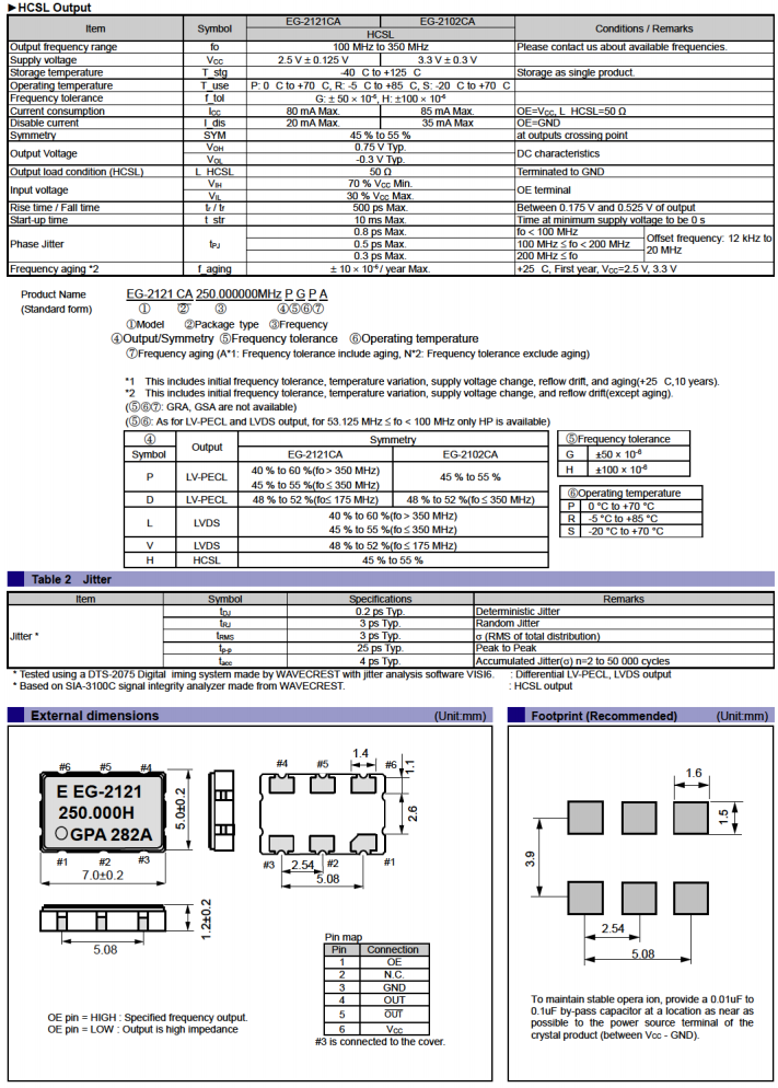 EG-2121CA160.000000MHzPGSA,愛普生差分輸出晶振,7050mm有源晶振參數表