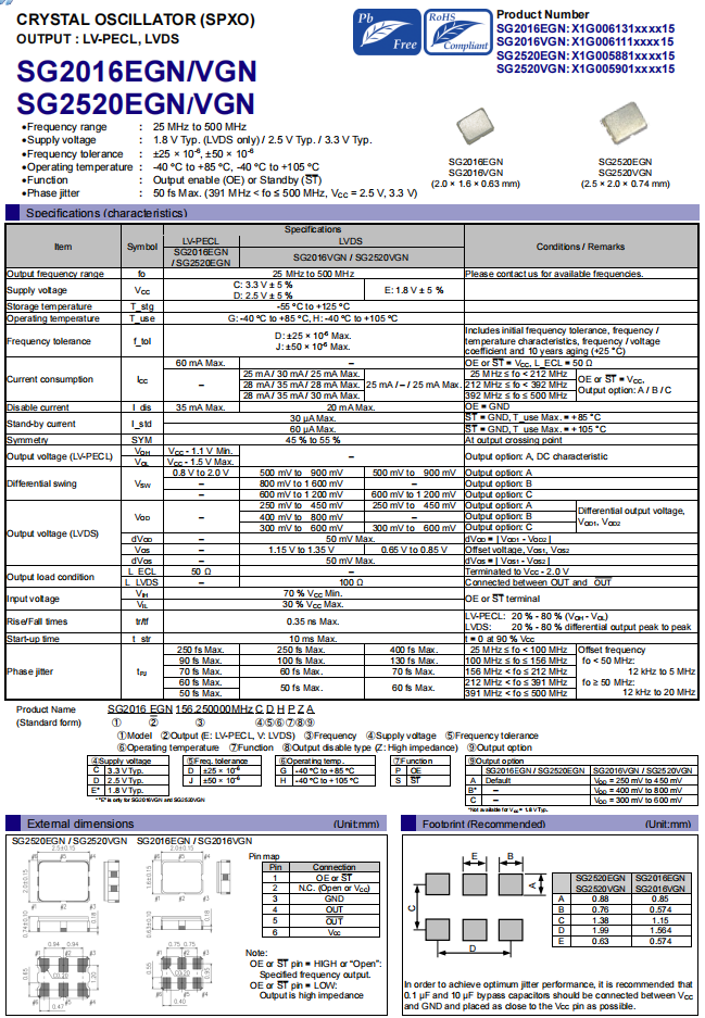 | X1G0059410010 | SG2520VHN | 156.250000 MHz | 2.50 x 2.00 x 0.84 mm | LVDS | 3.135 to 3.465 V | -40 to 85 °C |
