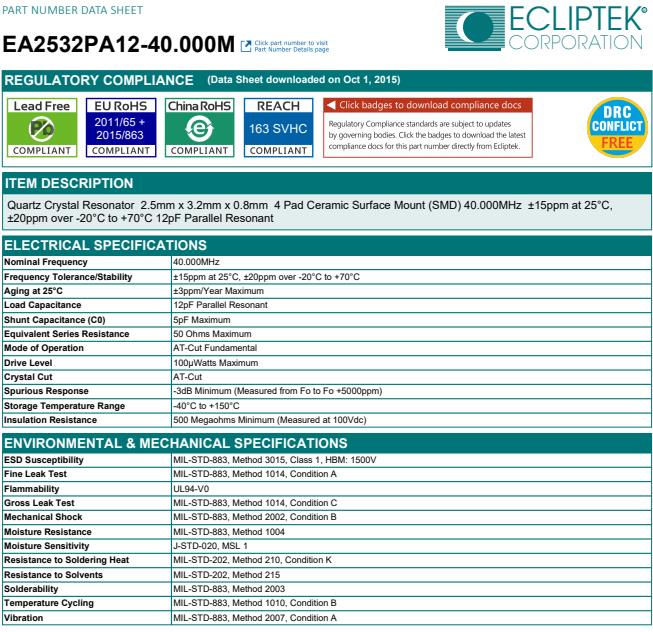 ECLIPTEK晶振將確保其振蕩器和石英晶體諧振器產品及相關設施滿足甚至超出國家的以及地方環保機構的相關法規規定及其他要求,同時該公司盡可能的參與并協助政府機關和其他官方組織從事的環保活動. 在地方對各項設施的管理責任中,確保滿足方針的目標指標,同時在各種經營與生產活動中完全遵守并符合現行所有標準規范的要求.ECLIPTEK晶振,EA2532PA12-40.000M晶振,3225mm貼片晶振.