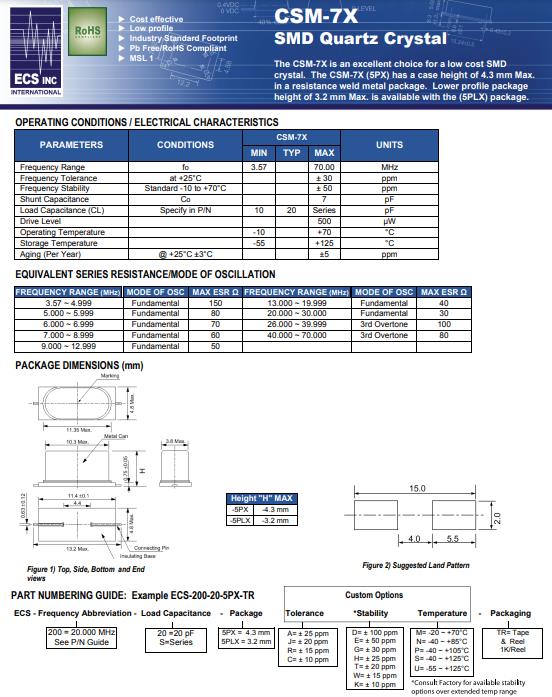 | ECS-50-S-5PX-TR | CSM-7X | 5MHz | ±30ppm | Series | -10°C ~ 70°C | HC49/US |