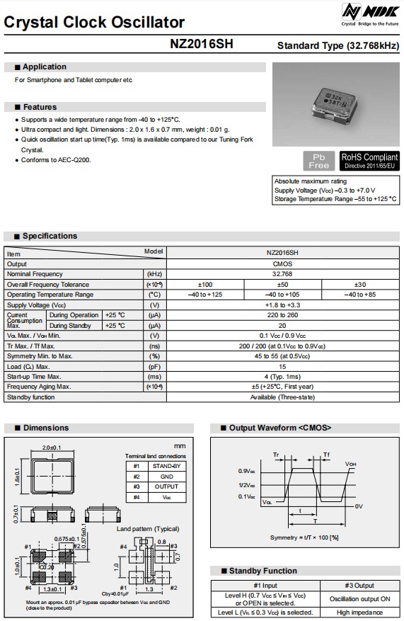NZ2016SH-24.000MHZNSC5022C平板電腦晶振,NDK晶體振蕩器,日本NDK晶振,進(jìn)口晶振,NZ2016SH型號(hào)是一款小體積晶振尺寸2.0x1.6x0.7mm四腳貼片晶振,32.768KHz晶振,石英晶體振蕩器,有源晶振,無(wú)鉛環(huán)保晶振,支持寬溫度范圍從-40°C到+125°C,超緊湊和輕,重量:0.01g,快速振蕩啟動(dòng)時(shí)間(類(lèi)型,1ms)是可用的相比,符合AEC-Q200,電源電壓(VCC)-0.3至+7.0 V,石英晶體振蕩器具有超小型,輕薄型,耐熱及耐環(huán)境特點(diǎn),適用于智能手機(jī),平板電腦,鐘表電子,無(wú)線網(wǎng)絡(luò),藍(lán)牙模塊,可穿戴設(shè)備,汽車(chē)電子,醫(yī)療設(shè)備,物聯(lián)網(wǎng)應(yīng)用等