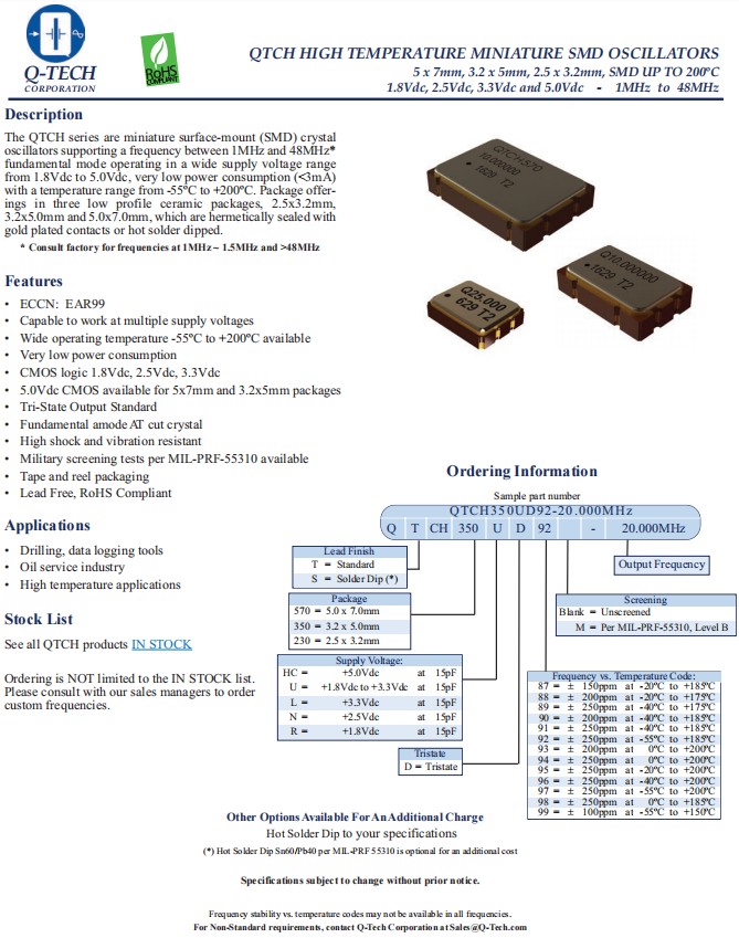 QTCH570ND90-40.000MHz|美國Q-Tech進口晶振|6G模塊晶振,Q-Tech晶振,歐美進口晶振,型號QTCH570,編碼QTCH570ND90-40.000MHz,是頻率40MHz的基模AT切割晶體,有源晶振,可根據(jù)MIL-PRF-55310提供軍事篩選測試,尺寸7050mm,電壓2.5V,負載15pF,低功耗晶振,無鉛環(huán)保晶振,耐高溫晶振,6G模塊晶振,鉆井、數(shù)據(jù)記錄工具晶振,石油服務行業(yè)晶振,高溫應用晶振.