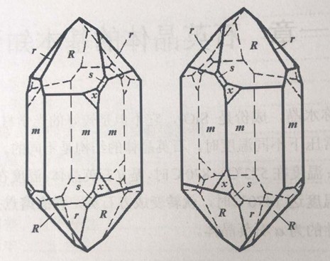 在結(jié)晶學(xué)中,石英晶體諧振器內(nèi)部結(jié)構(gòu)可以概括為是由一些“點(diǎn)子”在空間有規(guī)則地作周期的無(wú)限分布:“點(diǎn)子”代表原子、離子、分子或其集團(tuán)的重心。這些“點(diǎn)子”的總體稱(chēng)為點(diǎn)陣,構(gòu)成石英晶體的是二氧化硅分子,而二氧化硅分子的重心又正好與硅離子重合,因此硅離子的點(diǎn)陣就可以反映出石英晶體的內(nèi)部結(jié)構(gòu)。石英晶體的各層硅離子若按右手螺旋規(guī)則分布,則稱(chēng)為右旋石英晶體;若按左手螺旋規(guī)則分布,稱(chēng)為左旋石英晶體。從外形上看,右旋石英晶體的s面在R面的右下方或m面的左上方,左旋石英晶體的s面在R面的左下方或m面的右上方(見(jiàn)圖1.1.1),它們互為鏡象對(duì)稱(chēng)。