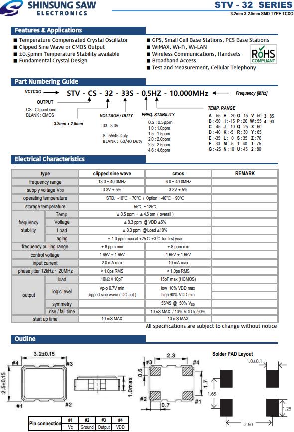 SHINSUNG晶振將確保其石英晶體振蕩器和石英晶體諧振器產(chǎn)品及相關設施滿足甚至超出國家的以及地方環(huán)保機構(gòu)的相關法規(guī)規(guī)定及其他要求,同時該公司盡可能的參與并協(xié)助政府機關和其他官方組織從事的環(huán)保活動. 在地方對各項設施的管理責任中,確保滿足方針的目標指標,同時在各種經(jīng)營與生產(chǎn)活動中完全遵守并符合現(xiàn)行所有標準規(guī)范的要求.韓國新松晶振,STV-32貼片溫補晶振,STV-CS-32-33S-0.5HZ-10.000MHz有源振蕩.