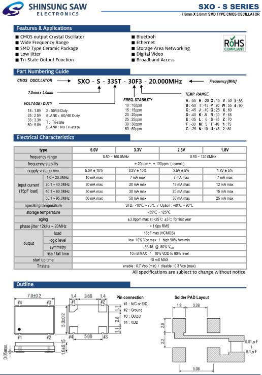 新松晶振,SXO-S藍牙有源晶振,SXO-S-33ST-30F3-20.000MHz晶振,小型SMD有源晶振,從最初超大體積到現(xiàn)在的7050mm,6035mm,5032mm,3225mm,2520mm體積,有著翻天覆地的改變,體積的變小也使產(chǎn)品帶來了更高的穩(wěn)定性能,接縫密封石英晶體振蕩器,精度高,覆蓋頻率范圍寬的特點,SMD高速自動安裝和高溫回流焊設計,Optionable待機輸出三態(tài)輸出功能,電源電壓范圍:1.8V~5V,高穩(wěn)定性,低抖動,低功耗,主要應用領域:無線通訊,高端智能手機,平板筆記本W(wǎng)LAN,藍牙,數(shù)碼相機,DSL和其他IT產(chǎn)品的晶振應用,三態(tài)功能,PC和LCDM等高端數(shù)碼領域,符合RoHS/無鉛.