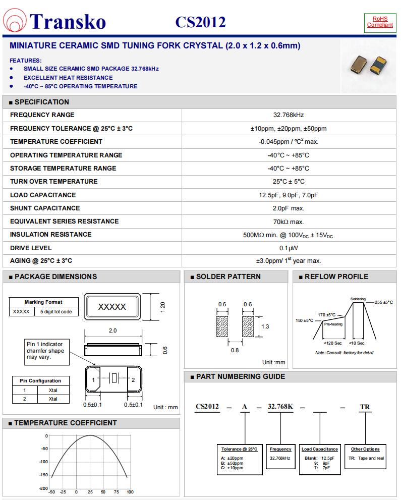Transko晶振|CS2012-A-32.768K-TR|2012mm|6G光纖通道晶振參數表