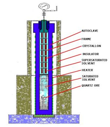 高品質的天然石英晶體數量有限,而且價格很高,這就促使了合成石英制造業的發展。合成石英晶體在垂直的高壓釜里生產,高壓釜以水熱法的原理工作,溫度大約為400℃,壓力為1000個大氣壓左右。籽晶放在高壓釜上部,天然石英原料被放在下部。升溫加壓的時候,高壓釜內的溶液呈堿性。高壓釜的加熱裝置,在容器內部制造出上部比下部溫度低的環境。這個溫度梯度造成溶解了底部天然石英的堿性溶液的對流,而且使天然石英沉積在頂部的籽晶片上。就是用這種方法生產,它可以在幾星期內長好幾百克。如果在溫度達到573℃的時候,α石英將相變成β石英(失去壓電特性)。