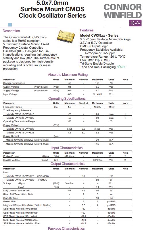 Connor-Winfield CWX8xx -該系列產品符合RoHS要求5.0x7.0mm表面安裝,固定晶體頻率控制時鐘晶體振蕩器(XO)。設計用于適用于頻率要求較緊的場合穩定性好,抖動小。表面安裝包裝為高密度設計安裝和是最佳質量生產。
