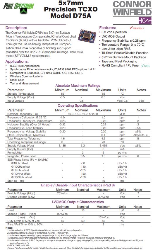 康納-溫菲爾德的D75A是一個(gè)5x7mm的表面安裝溫度補(bǔ)償晶體控制,編碼D75A-019.2M,型號D75A,具有三態(tài)LVCMOS輸出的TCXO晶體振蕩器。通過使用模擬溫度補(bǔ)償,D75A能夠保持低于1 ppm,在0至70°C溫度范圍內(nèi)的穩(wěn)定性。D75A滿足STRATUM 3要求。特點(diǎn):3.3 Vdc操作,lvcmos輸出,頻率穩(wěn)定性:±0.28 ppm,溫度范圍:0 ~ 70℃,低抖動(dòng)<1ps RMS,三狀態(tài)啟用/禁用功能,5x7mm表面安裝包,磁帶和卷軸包裝,符合rohs標(biāo)準(zhǔn)/無鉛.