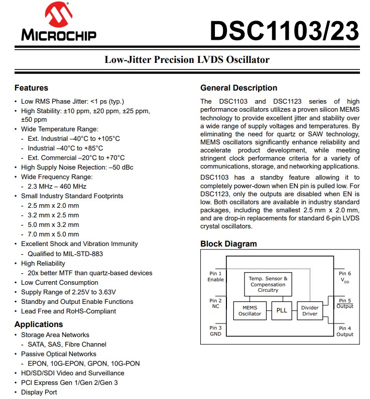 | DSC1103CI2-156.2500 | Microchip晶振 | DSC1103 | 156.25MHz | 2.25 V ~ 3.6 V | MEMS (Silicon) |