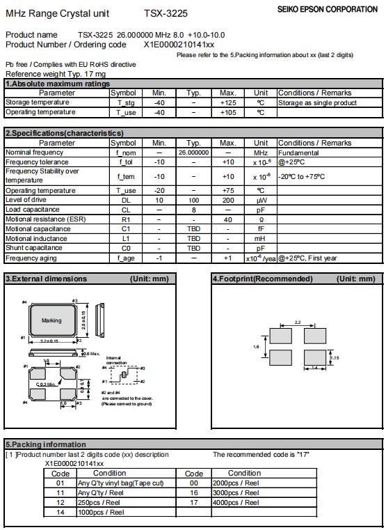 | X1E000021014116 | 3.2 x 2.5 x 0.6mm | TSX-3225 | 26.000000 MHz | 8 pF | +/-10 ppm | +/-10 ppm | -20 to +75 °C | ≤ 40 Ω |