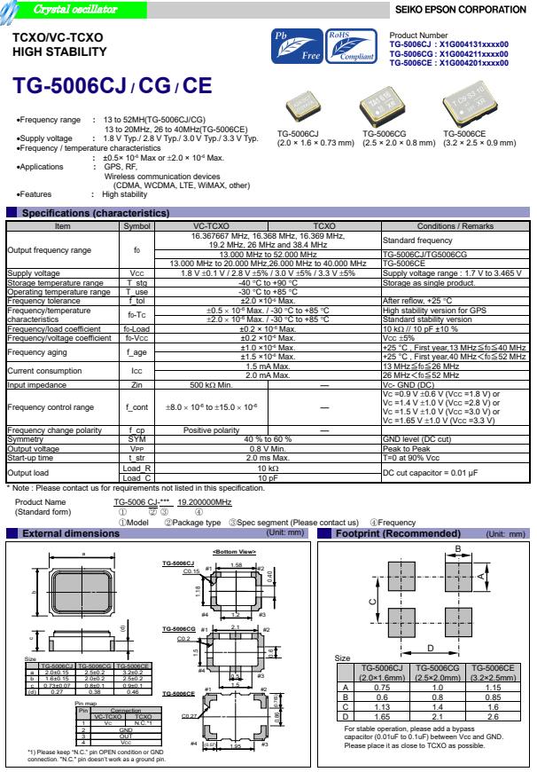 | X1G004211000500 | TG-5006CG | 26.000000 MHz | 2.50 x 2.00 x 0.80 mm | 1.700 to 1.900 V | +/-2.0 ppm | -30 to +85 °C | +/-2.00 ppm |