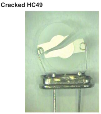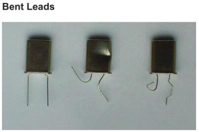 引線過度彎曲會損壞玻璃與金屬的密封,從而導(dǎo)致外殼的氣密性喪失。外殼充滿干燥的惰性氣體,氣密性的喪失會導(dǎo)致產(chǎn)品由于大氣污染而迅速劣化。因此,在處理晶體時應(yīng)注意不要拉扯或彎曲引線。如果需要通過彎曲的方式移動組件,則應(yīng)將引線稍微彎曲一點,使其遠(yuǎn)離玻璃密封件,以免破裂。推薦的最小曲率半徑取決于產(chǎn)品,例如HC49晶體為2mm,UM1s為1mm。