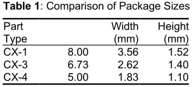 AT-cut quartz crystal resonators have been used in precision frequency control products for more than 60 years and today are among the most widely used crystal types. Although conventional AT crystals are disc shaped, the need for smaller components has led to the development of micro AT stripes. To meet manufacturers' needs for smaller components, Statek Corporation has developed ultra-small low profile, thin quartz crystals as part of its CX-4 family. For comparison, the CX-4 crystal requires only one-third of the land area of ??the CX-1 crystal and half of the land area of ??the CX-3 quartz crystal. (See Table 1 and Figure 1.)