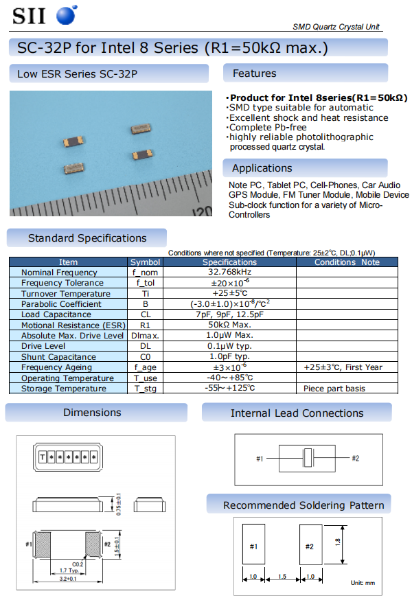 SC-32P儲存溫度是-55~125°C,標準工作溫度為-40~85°C,適用于自動貼片式,耐環境特性好,有著優異的抗震性和耐熱性,完全無鉛,符合RoHs環保標準,有著加工石英晶體高度可靠的光刻技術。SC-32P主要應用于采購產品PC,平板電腦,手機,汽車音響,采購產品GPS模塊,FM調諧器模塊,移動設備,分時鐘功能適用于各種微時鐘控制器。