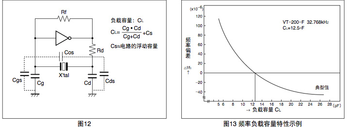 負(fù)載容量 (CL) 是用來決定在振蕩電路中晶振頻率的參數(shù),從加在振蕩電路中晶振兩端的電容可知負(fù)載容量(參閱圖12). 因振蕩電路的負(fù)載容量的不同,晶振的頻率會(huì)相應(yīng)地產(chǎn)生變動(dòng).為了獲得目標(biāo)的頻率精度,必須使晶振與負(fù)載容量相匹 配.在使用時(shí),請(qǐng)根據(jù)相應(yīng)晶振的負(fù)載容量,將振蕩電路的負(fù)載容量設(shè)定為與其相符.