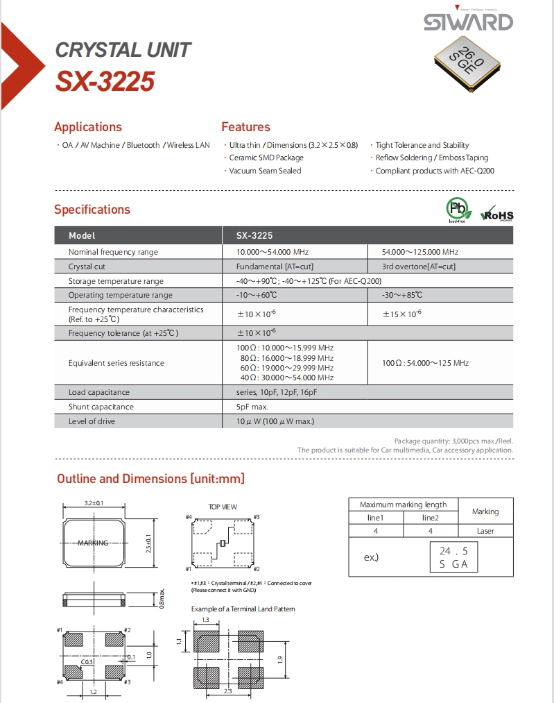 | XTL571150-F98-063 | Siward晶振 | SX-3225 | 24 MHz | ±15ppm | 18pF | -20 ℃~70 ℃ |